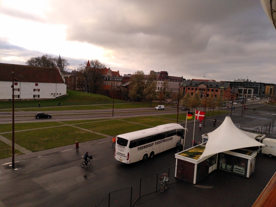 Das weiße Gebäude im Hintergrund links ist die alte Festung Aalborghus Slot. Und vor dem braunem Gebäude rechts über den Fahnen geht es direkt in die Altstadt. Das ist fast so wie in Hamburg mit den Fähren an den Landungsbrücken – mitten in der Stadt.