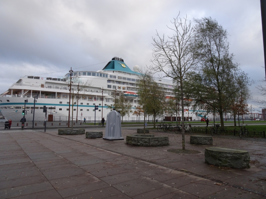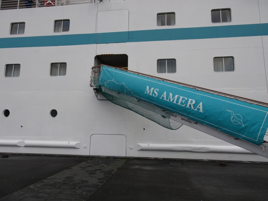 Als ich da Schiff verlasse, bestaune ich erst mal von unten die Gangway, die von Deck 5 direkt zum Kai geht.