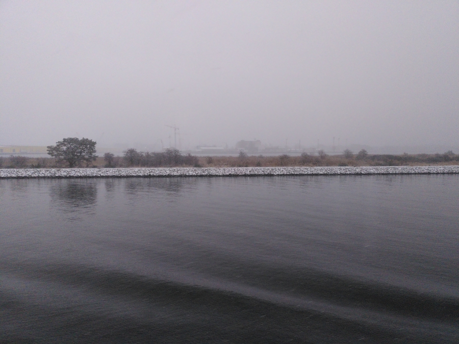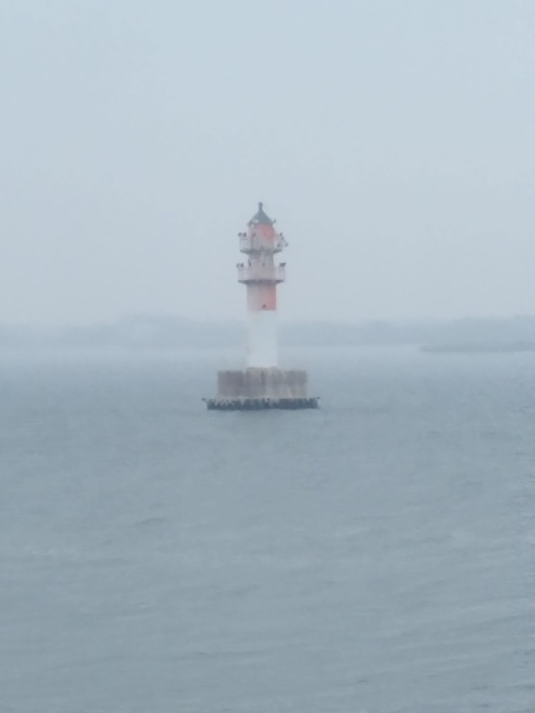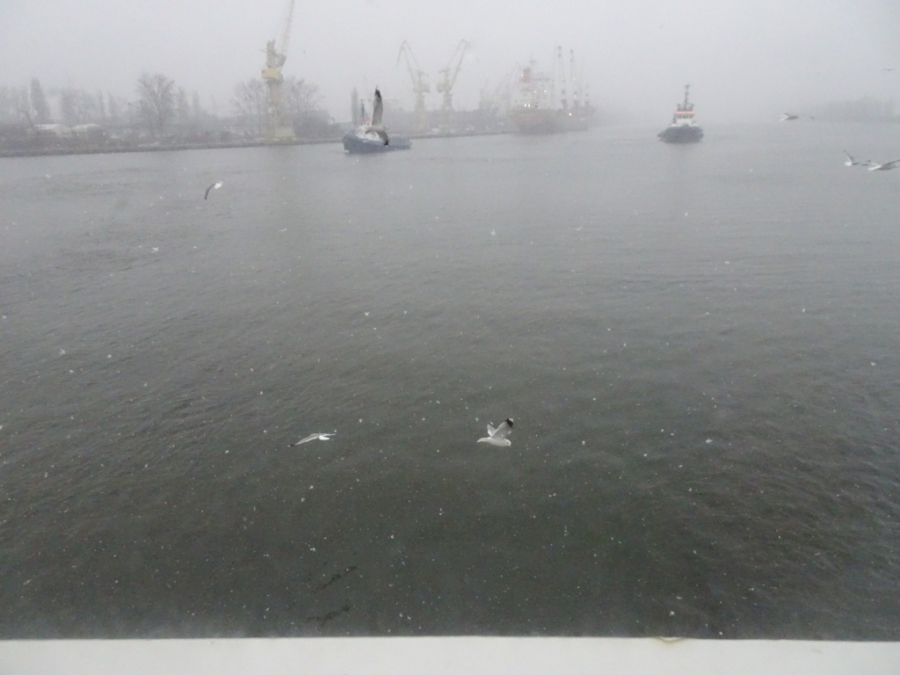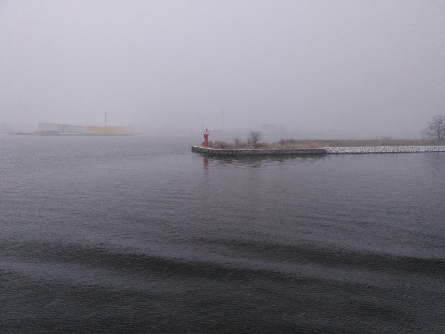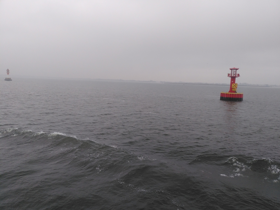 Nach einer ruhigen und erholsamen Nacht stehe ich für meine Verhältnisse wieder früh auf (kurz nach 8:00) und werfe wie üblich erst einmal einen Blick aus dem Fenster. Wir sind bereits im Stettiner Haff, werden aber noch gut 4 Stunden bis zum Anlegen in Stettin brauchen. Mein Ausflug beginnt auch erst um 13:40. Also muss ich mich nicht beeilen und kann erst einmal in aller Ruhe die Fahrt durch das Haff beobachten und auch einige Fotos machen. Das Wetter ist auch wirklich nicht besonders gut. Es ist einfach kalt, nass und diesig, so dass alles, was etwas weiter weg ist, einfach im Dunst verschwindet.