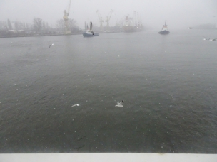 Im leichten Schneeregen gehen wir im leicht matschigen Industriehafen die kurze Strecke zum Ausflugsbus. Die Fahrt geht zuerst gefühlt durch den ganzen Industriehafen bevor wir die eigentliche Stadt