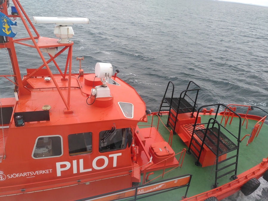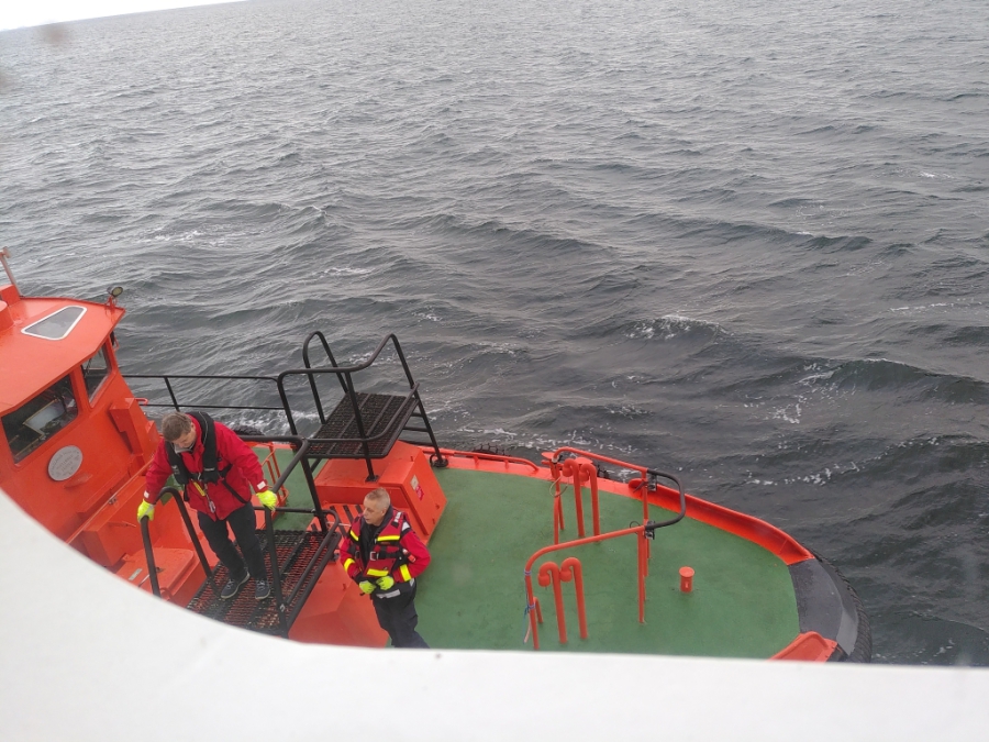 Es ist da oben ganz schön kalt und windig. Deshalb gehe ich wieder nach Innen und bringe erst einmal meinen Mantel in meine Kabine. Dort komme ich gerade rechtzeitig an, um zu beobachten, wie ein Lotse an Bord kommt: