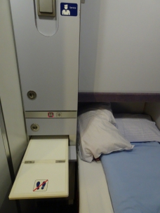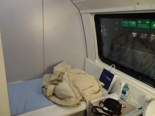 Das Abteil ist winzig, aber es hat ein Bett (das auch als Sitzgelegenheit dient), große Fenster an der Seite und im gewölbten Dach und ein kleines Waschbecken mit Abdeckung. Das 2. Bett ist hochgeklappt. Ein paar kleine Schränke und Klapptische sind auch vorhanden. Und unter dem Bett ist Platz für das große Gepäck.