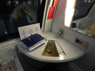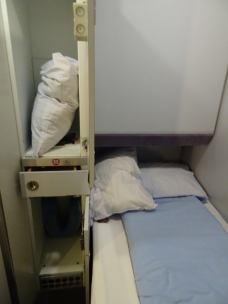 Als der Zug dann abfährt, esse ich erst einmal den Strudel und den Donut auf und spüle das Ganze mit dem noch direkt verteilten Sekt (kleine Flasche) runter und richte alles zum Schlafen. Weil ich keine Lust habe, mit dem Kopf in der Höhle unter dem hochgeklappten Bett und neben dem Schrank zu liegen, hole ich die Kopfkissen ans Fenster. Unterwegs werde ich ein paar mal wach, wenn der Zug hält. Aber ich schlafe dann auch gleich wieder ein. Das geht so lange gut, bis mich etwas total Unerwartetes kalt erwischt.