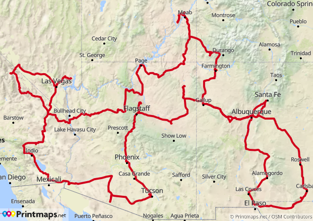 Las Vegas – Valley of Fire – Death Valley – Grand Canyon – Page – Monument Valley – Moab (Canyonlands und Arches) – Mesa Verde- Santa Fe – Albuquerque – White Sands – Carlsbad – Canyon de Chelly- Petrified Forest – Sedona - Tucson – Yuma – Joshua Tree – Las Vegas