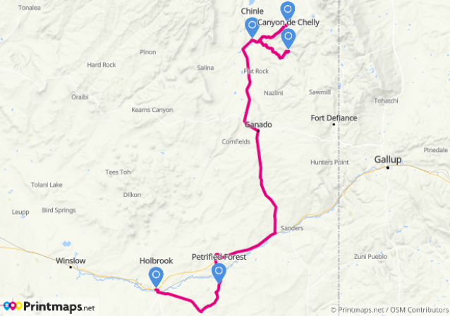 Nach einem selbstgekochten Kaffee (Pulver und Maschine wurden vom Hotel gestellt, und wenn man aus einer 4-Portionen-Packung Kaffee eine Portion Kaffee macht und die Pulvertüte statt im Filter in der Kanne ziehen lässt, hat man auch mal wieder richtigen Kaffee und nicht nur das, was die Amerikaner als Kaffee bezeichnen) und einem Blaubeerbagel aus meinen Vorräten konnte es losgehen. Geplant waren heute der Nord-Rim des Canyon de Chelly (der eigentlich Canyon de Muerte heißt) der Süd-Rim des Canyon de Chelly (der eigentliche Canyon de Chelly) und dann die Weiterfahrt zum Petrified Forest sowie dessen Besichtigung.