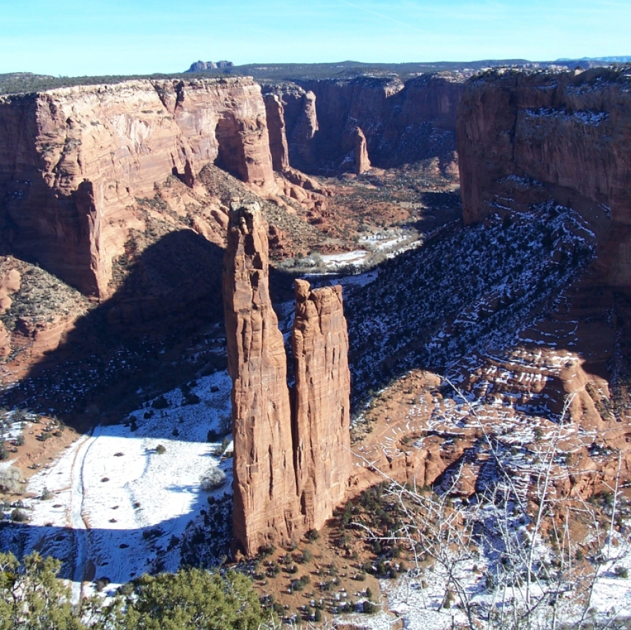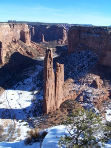Dann konnte ich mich wieder einige Zeit im Auto aufwärmen. Draußen war die Temperatur immerhin schon auf -7° C angestiegen und es sollte sogar noch wärmer werden. Aber Plusgrade wurden erst bei meiner Fahrt zum Petrified Forest erreicht. Das Nord-Rim hatte ich quasi von vorne nach hinten aufgerollt, da die Aussichtspunkte alle südlich der Straße, die ich von Westen nach Osten fuhr, lagen. Beim Süd-Rim lagen die Aussichtspunkte naturgemäß nördlich der von Westen nach Osten führenden Straße, so daß ich erst einmal das ganze Rim abfuhr und dann Aussichtspunkt für Aussichtspunkt zurückkehrte. So begann ich also mit dem berühmten Spider Rock, einem Felsen, der einfach wie eine doppelte Nadel mitten im Canyongrund steht, der schon voll von der Sonne angestrahlt wurde.