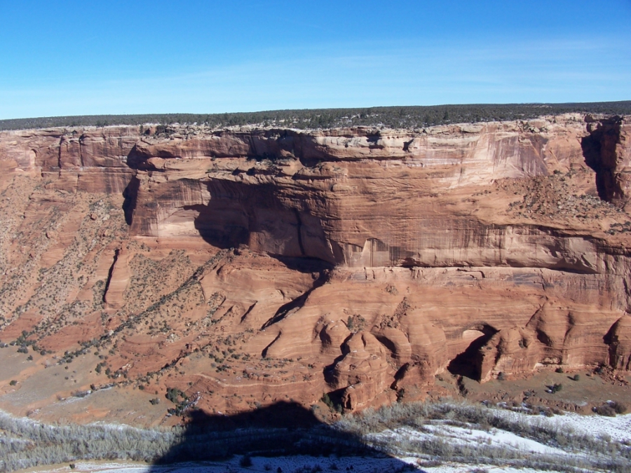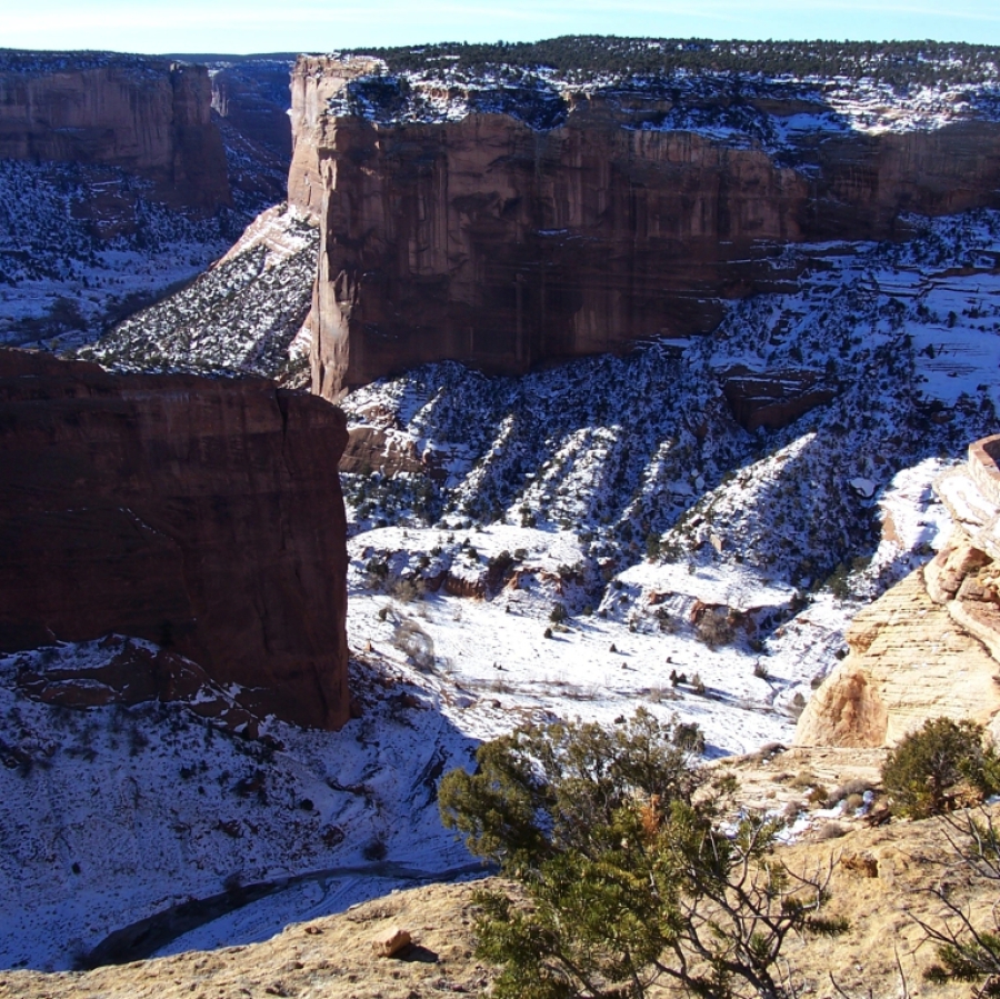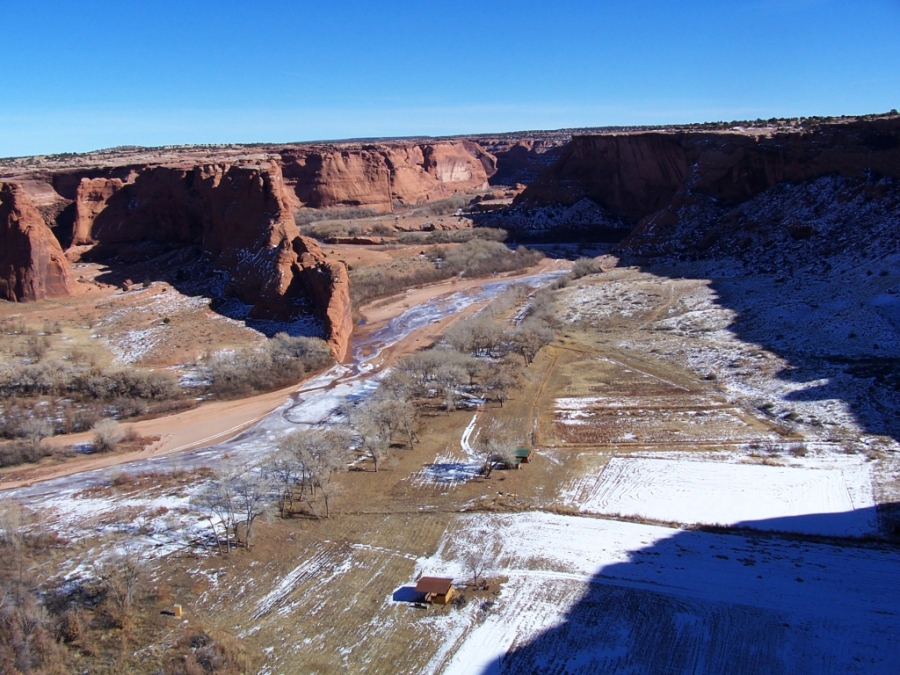 Der Canyon selbst darf ohne Navajo-Führer von Touristen nur an einer Stelle betreten werden: Es gibt unten im Canyon Pueblo-Ruinen und zu diesen darf vom Aussichtspunkt aus hinab- und wieder hinaufgestiegen werden. Da es aber so kalt war, noch Schnee- und Eisreste auf den Wegen lagen, der Weg logischerweise am nach unten führenden Süd-Rim von der Sonne nicht richtig beschienen wird, und ich in Mesa Verde bereits mit weniger Anstrengung an eher besser erhaltene Ruinen gekommen war, habe ich auch in Anbetracht der bereits fortgeschrittenen Zeit auf diese Wanderung verzichtet (es war mir eigentlich schon beim ersten Blick auf ein Thermometer klar, dass diese Wanderung gestrichen würde).