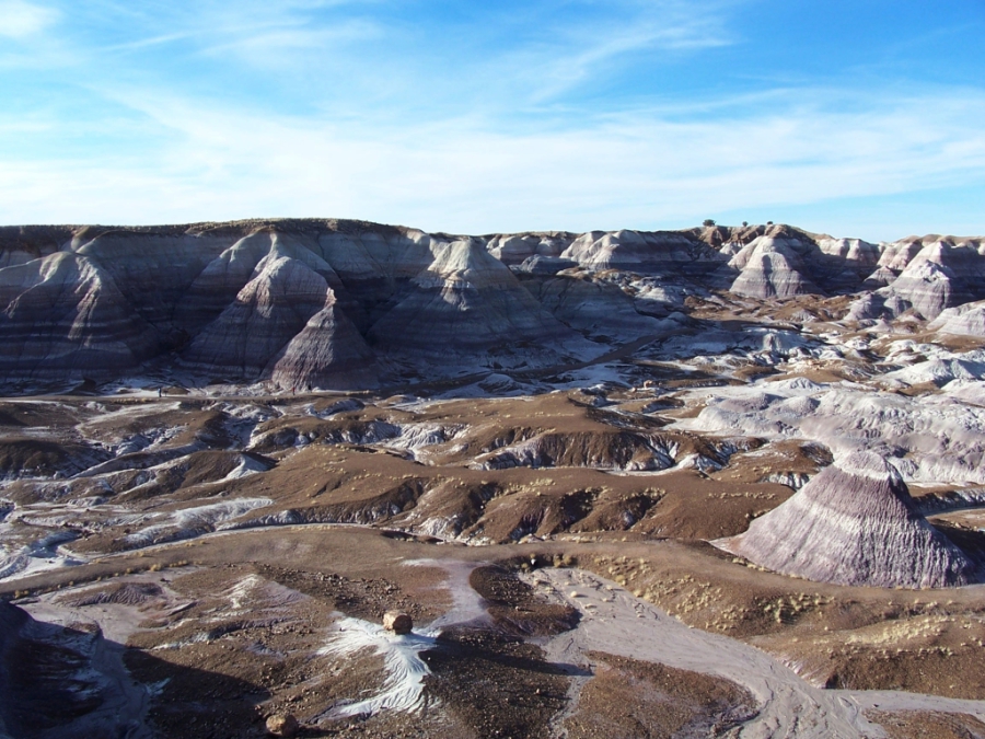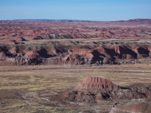 Da ich vor fast 4 Jahren schon einmal im Petrified Forest war, aber aus Zeitmangel (bzw. Unlust meiner Mitreisenden) nicht alles sehen konnte, habe ich heute die damals besuchten Punkte in Japaner-Manier abgehakt (d.h. Aussichtspunkt anfahren, raus aus dem Auto, einige Fotos machen, weiterfahren zum nächsten Aussichtspunkt). Aufgrund der winterlichen Temperaturen (5° C) war die Luft sehr klar und die Sicht sehr viel besser als im April 2004. Deshalb sind es auch von der Painted Desert wieder mehr Bilder geworden, als ich eigentlich geplant hatte.