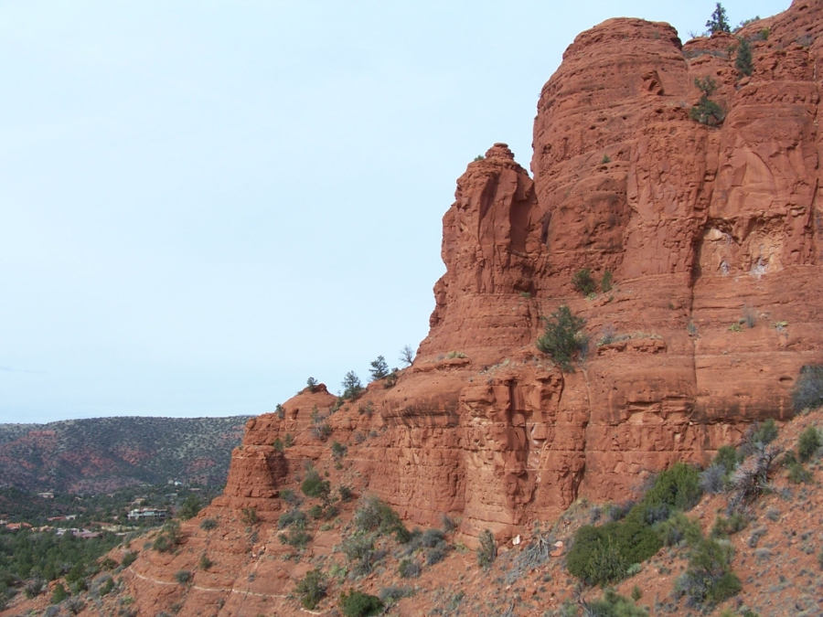 So gerüstet ging es los nach Sedona. Zuerst wieder etwa 15 km Autobahn, bis dann die kleine Landstraße abzweigte. Und schon bald kamen die ersten roten Felsen in Sicht und fast gleichzeitig auch die Baustelle. Und dies war die erste richtig lange Baustelle, über die ich mich nicht geärgert habe. Bot doch die erzwungene Fahrt mit weniger als der Hälfte der sonst erlaubten Höchstgeschwindigkeit die Gelegenheit, die Umgebung so richtig zu genießen.