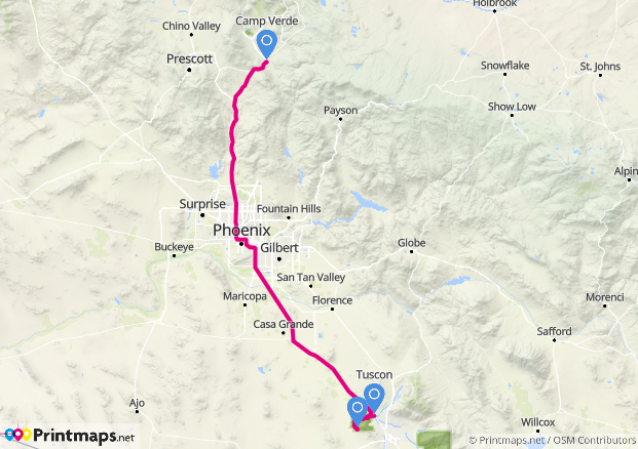 In der Hoffnung, dass die Kopfschmerztabletten mal wirken würden und meine Müdigkeit nur vorübergehend war, fuhr ich nach dem Auschecken einfach mal los. Die Strecke war auch verhältnismäßig einfach: Immer nur Autobahn, bis sie in Phoenix dann plötzlich 6-spurig wurde und ich auch noch auf eine andere Autobahn wechseln musste. Das hat aber erstaunlicherweise ausgezeichnet funktioniert; Ich fuhr einfach in meiner Spur und folgte Bonnies Anweisungen. Inzwischen hatte ich auch gelernt, nicht nur die aktuellen Anweisungen zu beachten, sondern auch den nächsten angezeigten Richtungswechsel. Und so konnte ich meistens rechtzeitig die Spur wechseln. Das klappte nur immer dann nicht, wenn die rechte Spur plötzlich zur Rechtsabbiegerspur wurde und ich nicht mehr nach links rüber kam. Da kamen dann immer die bekannten Sprüche vom Wenden, die mich so furchtbar nerven.