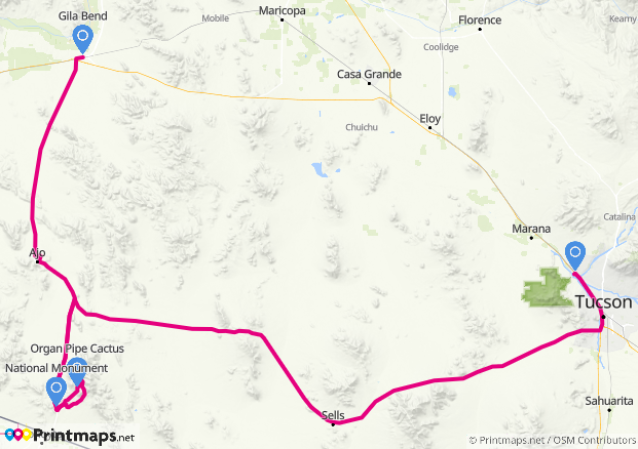 Dann musste ich mich leider von dieser schönen Gegend verabschieden; wollte ich doch noch etwa 100 km weiterkommen, bevor ich mir in Gila Bend ein Nachtquartier suchte. Unterwegs traf ich dann mal wieder auf die Border Patrol. Diesmal musste ich den Ausweis nicht zeigen, aber die hinten getönte Scheibe herunterlassen, damit der Grenzbeamte auch mein ganzes Futter- und Jackenlager einschließlich Wanderstiefeln hinten sehen konnte. Nach der Frage nach woher und wohin wünschte er mir noch einen schönen Urlaub und ließ mich weiterfahren. Woher wusste der wohl, dass ich Urlaub mache? Ich hatte das jedenfalls nicht ausdrücklich erwähnt.
