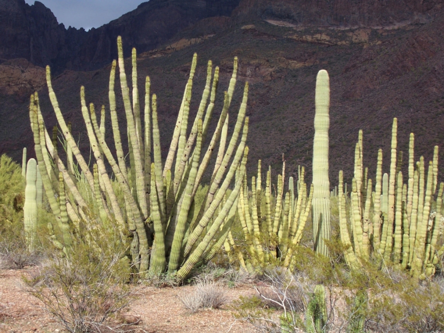 Dann war ich endlich im Organ Pipe Cactus Nationalmonument, das seinen Namen einer Kakteenart verdankt, die weltweit nur hier wächst, den Organ Pipes. Seit ich zum ersten Mal Bilder von dieser Kakteenart sah, die mit viele dicken Stengeln aus einer Wurzel zu kommen scheint, wollte ich sie mit eigenen Augen sehen. Und deshalb war mir der eine Tag Umweg nur für diese Kakteen (und auch all die anderen, die ich unterwegs sehen konnte) auch nicht zu viel; bedeutete es doch einen ganzen Tag mit meinen Freunden. Falls es jetzt noch nicht klar ist: Ich finde die Sonora-Wüste mit ihren Sträuchern, gelben harten Grasbüscheln und den Kakteen einfach unglaublich schön und faszinierend. Da kann ich stundenlang durchfahren, ohne dass mir langweilig wird.