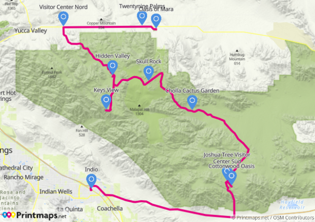 Aber irgendwann hat jeder Park ein Ende und ich zeigte beim Passieren des Westeingangs dem Parkranger meinen Nationalparkpass. Da man im Süden ja einfach so in den Park fahren kann und quasi freiwillig im Visitor Center den Eintritt bezahlt, werden bei den beiden besetzten Eingängen eben auch aus dem Park fahrende Autos kontrolliert und zur Kasse gebeten. Mein nächstes Ziel war das Visitor Center im Ort Joshua Tree, das zu diesem Eingang gehört. Mann, war das gut versteckt. Die Hinweisschilder waren nur zu sehen, wenn man in Richtung Park fuhr, was ich auch tat. Anhand meiner Parkkarte wusste ich ja ungefähr, wo ich das Visitor Center zu suchen hatte. Aber es bot nichts interessantes.