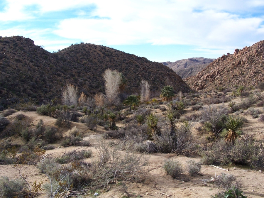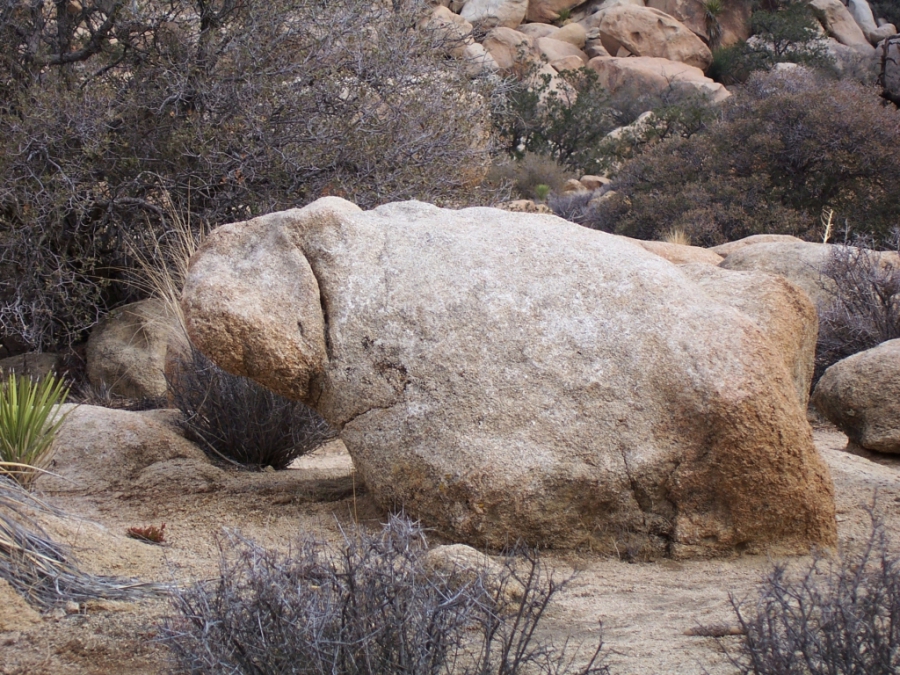 Als nächstes kam dann die kleine Wanderung dran, die als Ersatz für die zu anstrengende Wanderung zur Oase dienen sollte. Da führte der Weg zuerst durch eine sehr enge Passage in riesigen Felsblöcken, um dann in einem verborgenen Tal zu münden. In diesem von hohen, schroffen Felsen umgebenen Tal war eine eigene kleine Welt zu finden mit verhältnismäßig üppiger Vegetation, die außer aus Yuccas und Joshua Trees auch noch aus Koniferen und anderen Sträuchern bestand. Und das alles war immer wieder durchsetzt von unglaublich großen Felsbrocken.