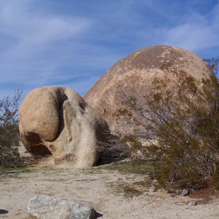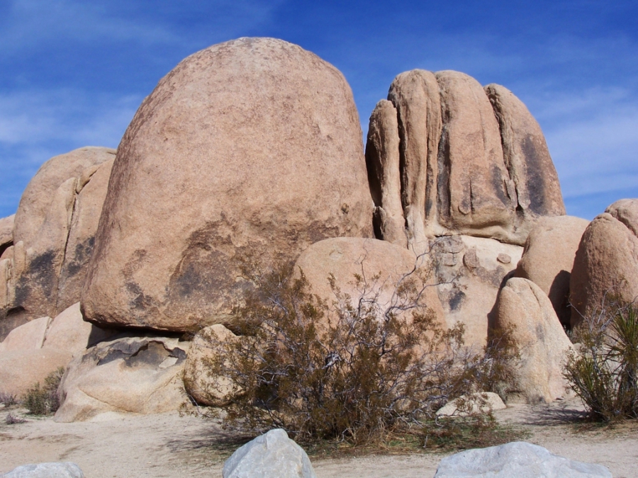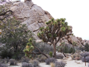 Der Hunger meldete sich jetzt und so habe ich meinen Muffin mit einem Teil des Cappuccinos (heute fasste der Eimer sogar gut 700 ml) im Auto mit Blick auf den Cholla-Garten verspeist. Draußen war es mir noch zu kalt. Bei der Weiterfahrt nach Norden verschwanden die Chollas wieder und dafür tauchten plötzlich riesige Felsbrocken auf. Auch die Vegetation änderte sich; jetzt war ich nicht mehr in der Colorado-Wüste sondern in der Mojave-Wüste mit den für sie typischen Joshua Trees, die dem Park seinen Namen gaben.