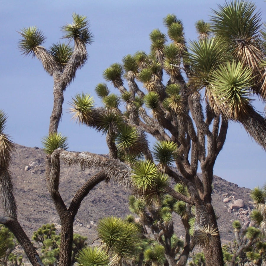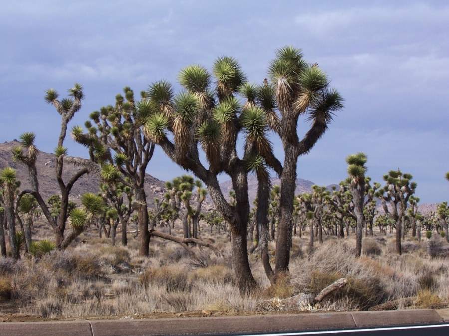 Die Fahrt Richtung Westeingang ging weiter durch richtige Joshua Tree Wälder. Endlich konnte ich mich mal an Joshua Trees so richtig sattsehen. Außerhalb des Joshua Tree Nationalparks treten diese Riesenyuccas (Joshua Trees sind die größten Yuccas, die es gibt) immer nur einzeln oder in kleinen Gruppen auf und man hat keine Haltebuchten, von denen aus man diesen Anblick so richtig genießen kann.