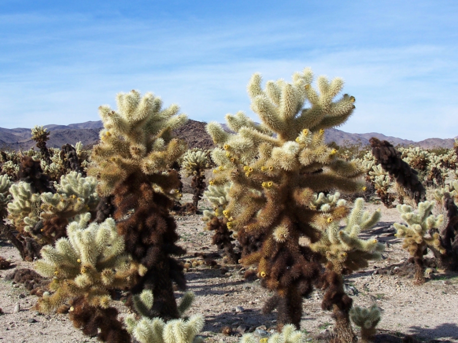 Im Südteil des Joshua Tree Nationalparks, den ich gerade durchfuhr, findet man die Colorado-Wüste, die sehr karg ist und auf deren Geröll hauptsächlich ein paar Sträucher und Chollas wachsen. Und die Chollas traten plötzlich nicht nur mehr vereinzelt auf sondern in großen Mengen, wie in einem Garten. Auch wenn diese Kakteen richtig flauschig aussehen, wird vom Berühren dringend abgeraten, da die Stacheln, die dieses flauschige Aussehen erst ermöglichen, so mit das Fieseste sind was es im Joshua Tree Nationalpark gibt: Die haben Widerhaken, mit denen sie sich so richtig festhaken können in der Haut. Also habe ich sie lieber nicht gestreichelt sondern nur aus sicherer Entfernung fotografiert.