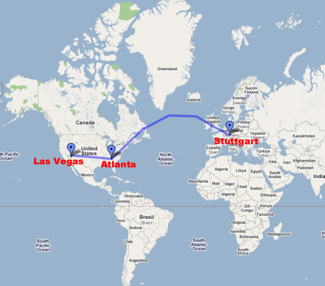 Begonnen hat das Ganze kurz vor 9 Uhr in Stuttgart (A) mit dem üblichen Sicherheitsgespräch, dem man sich schon seit einer Ewigkeit unterziehen muss. Da wird dann gefragt, warum man nach Amerika will, wer den Koffer gepackt hat, ob der Koffer danach unbeaufsichtigt war, ob man von jemand anderem etwas zum Transport nach Amerika mitbekommen hat, welche technischen Gegenstände man mitführt, wem die gehören (natürlich alle mir), ob die kürzlich zur Reparatur waren und noch weitere nette Fragen in diesem Stil. Wenn man diesen Test bestanden hat, kann man endlich einchecken und die Koffer loswerden.