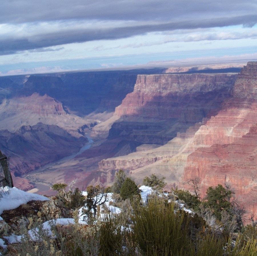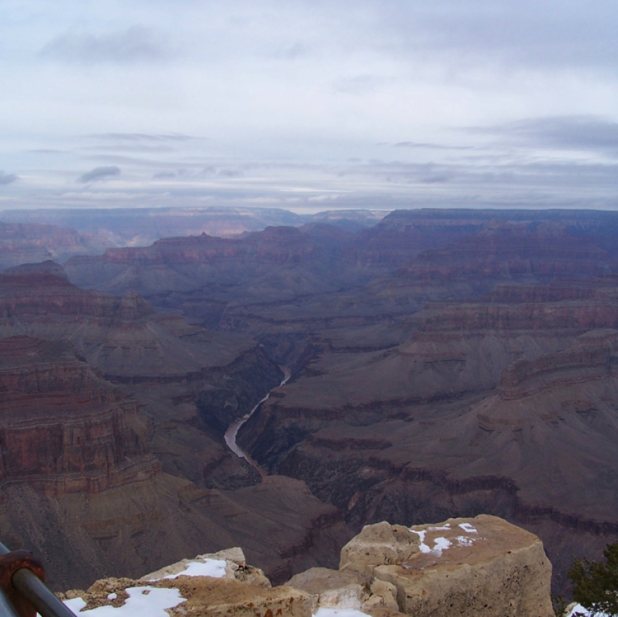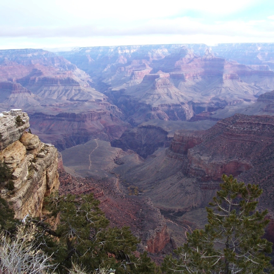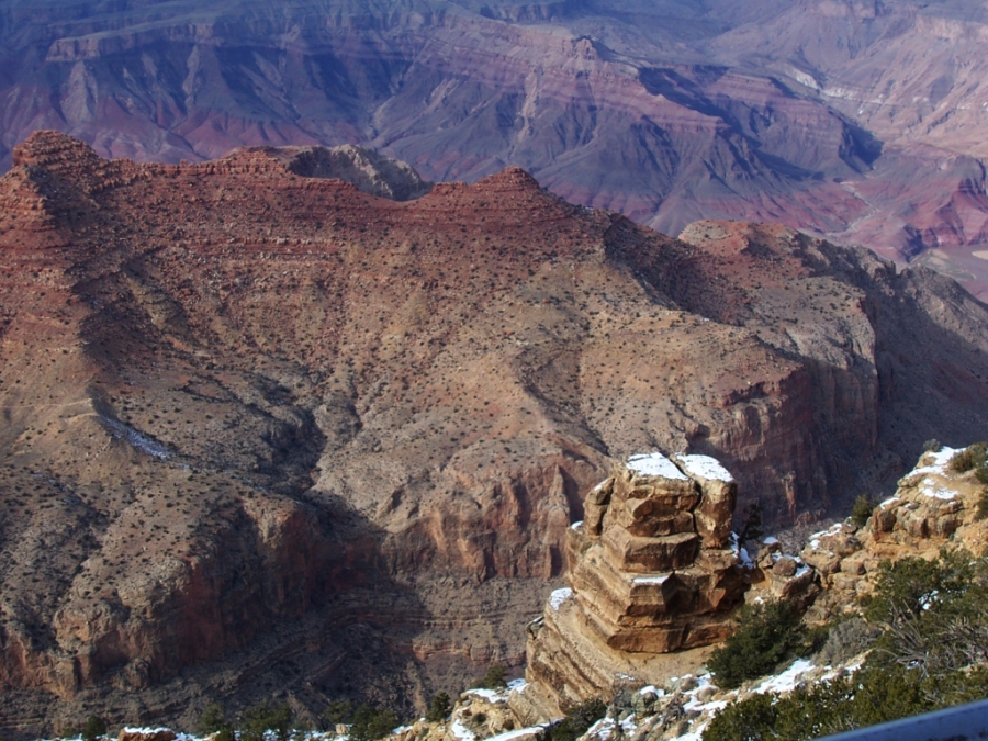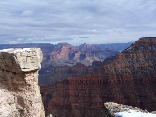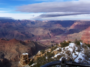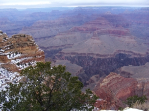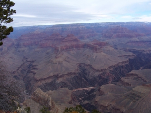 Dann endlich war ich am ersten Aussichtspunkt. Es ist schon ein riesiges, beeindruckendes Loch. Aber so richtig vom Hocker gerissen hat es mich nicht. Und das lag sicher nicht daran, dass die Temperatur nur so um den Gefrierpunkt oder der Himmel bedeckt war. Die Temperatur war zwar nicht besonders schön, aber ich hatte eher mit weniger gerechnet; schließlich ist der South Rim (südlicher Rand mit jeder Menge Aussichtspunkten) zwischen 2000 und 2300 m hoch. Und auf der Fahrt nach Osten kam auch noch die Sonne heraus und hat voll auf die Felsen geschienen. Mir haben einfach das Valley of Fire und das Death Valley um einiges besser gefallen. Trotzdem habe ich viele Fotos gemacht.