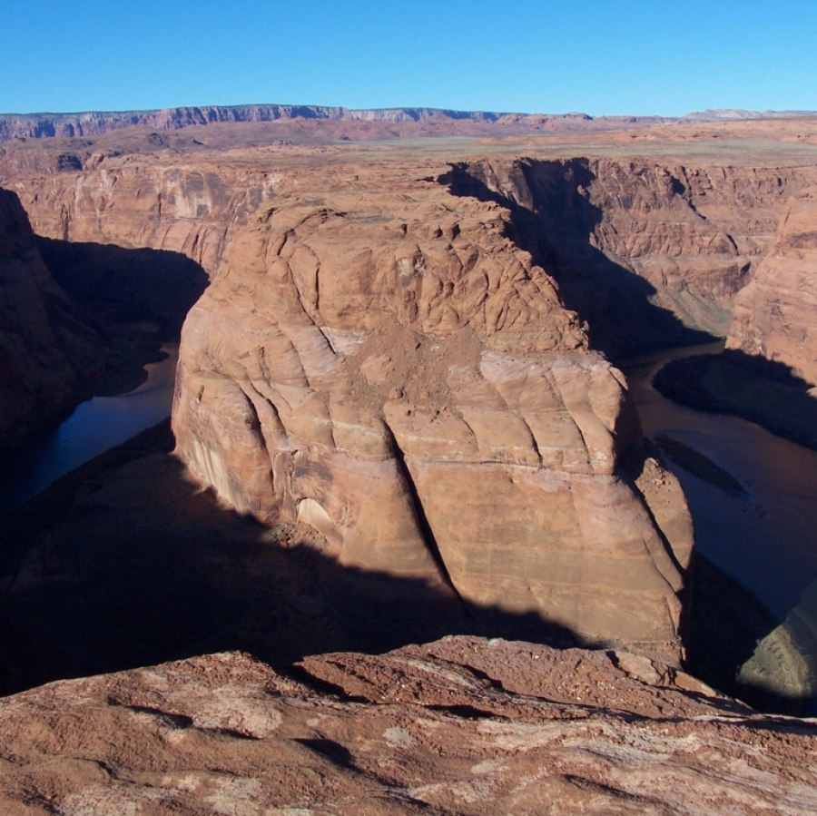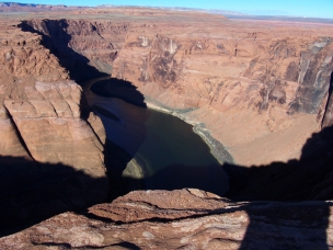 Nach dem Kaffee ging ich los, eine Tour in den Antelope Canyon für 11:30 zu buchen. Da noch fast 2 Stunden Zeit waren, fuhr ich noch schnell zum Horseshoe Bend, einem ganz in der Nähe von Page liegenden Aussichtspunkt auf eine Schleife des Colorados. Auf dem Weg vom Parkplatz zum Aussichtspunkt und zurück kam ich schon mal ganz schön ins Schwitzen: es ging nämlich in beide Richtungen durch tiefen Sand bergauf über einen Hügel. Aber die Aussicht war die Anstrengung wert, obwohl ich Hasenfuß mit meiner Höhenangst mich nicht bis ganz an den Rand gewagt habe.