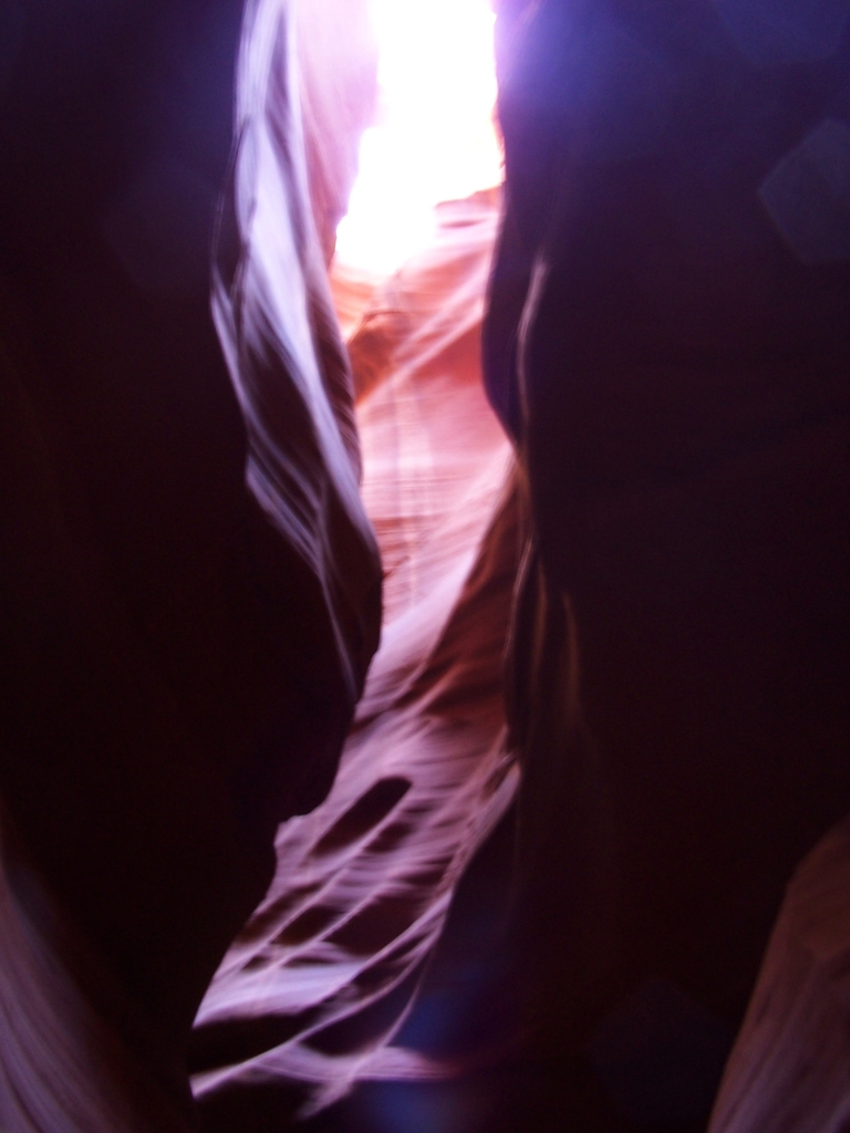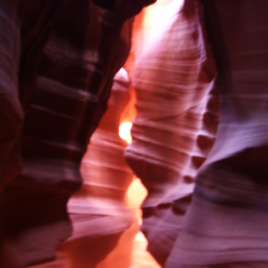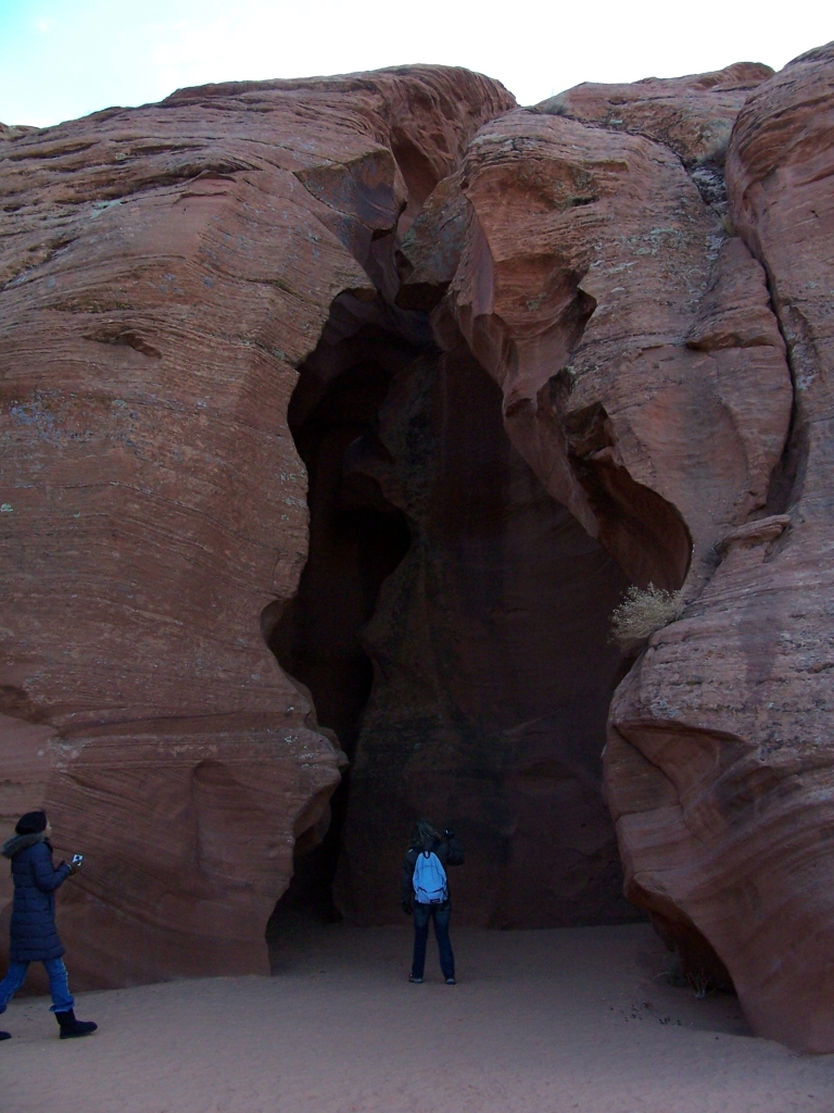 Wir durften 1 Stunde im Canyon bleiben. Da aber die anderen Besucher mit ihrer Tour bereits am Gehen waren, hatten wir 5 den Canyon ganz für uns allein. Und so war 1 Stunde außerordentlich reichlich bemessen. Unser Führer, eine Navajo, ging durch den Canyon voraus und machte uns auf besondere Motive aufmerksam. Am Ende angekommen, ging sie wieder voraus zurück zum Auto. Auch die anderen 4 gingen einiges schneller zurück zum Auto. Und auch ich hatte nach 45 Minuten genug fotografiert und vor Kälte ganz steife Finger. Mein kleines Stativ leistete mir hier gute Dienste; hatte ich doch die Belichtungszeit teilweise auf 8 Sekunden gestellt. Trotzdem sind sehr viele der Bilder aus der freien Hand aufgenommen.