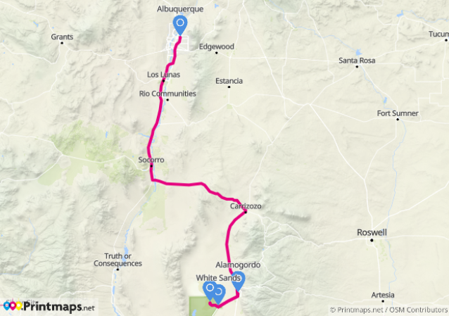 Als ich genug weißen Sand (Gips) gesehen und wieder aus meinen Schuhen entfernt hatte, fuhr ich wieder nach Alamogordo zurück und suchte mir eine Unterkunft und fand ein schnuckeliges kleines Motel. Den Mexikaner, der mir dort für das Abendessen empfohlen wurde, werde ich wohl morgen noch einmal zum Frühstück heimsuchen, so gut hat es mir dort geschmeckt.