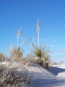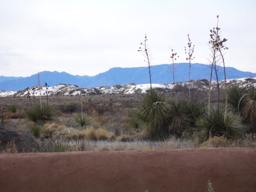 White Sands präsentierte sich schon gleich zu Beginn sehr eindrucksvoll. Das Visitor Center war im Adobestil gebaut und gefiel mir sofort. Und vor dem Visitor Center waren Beete mit hier heimische Pflanzen angelegt. Im Frühjahr, wenn alles blüht, muß das noch viel schöner aussehen. Und schon neben dem Visitor Center hoben sich die ersten weißen Dünen gegen die dunklen Berge ab.