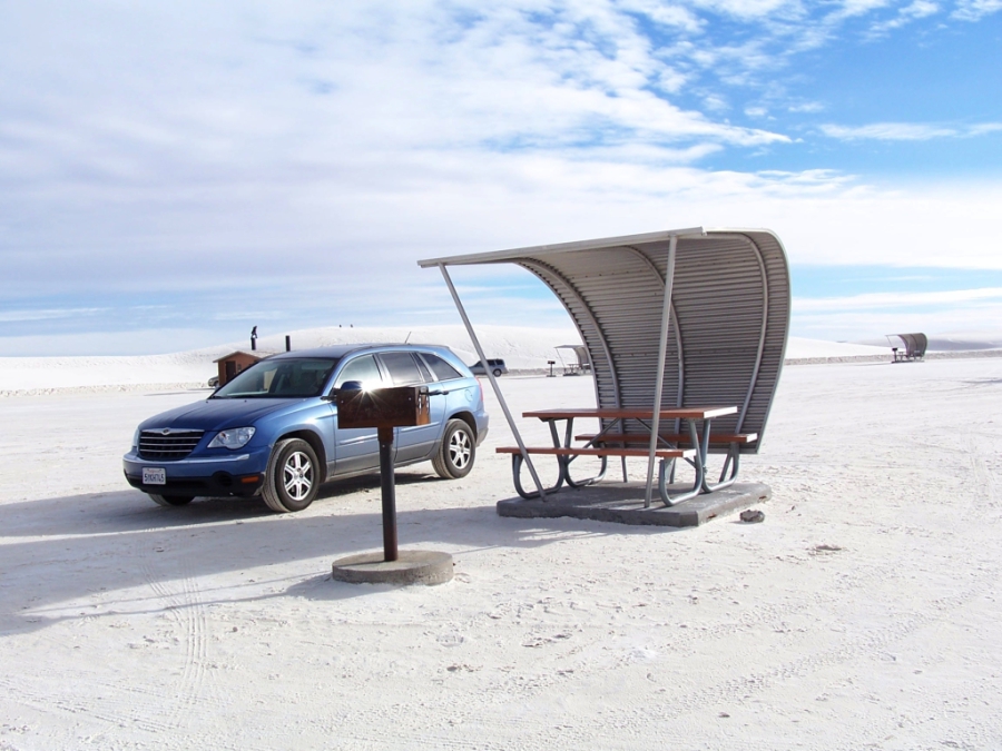 Als die geteerte Straße dann zu Ende war, ging es erst richtig los. Man fuhr einfach auf dem plattgewalzten Gips weiter mitten hinein in die Dünen. Dort ist eine Art riesiger Spielplatz angelegt. Überall gibt es Buchten, in denen man das Auto parken und einfach so mitten in die Dünen steigen kann. Vier oder fünf große, plattgewalzte Flächen sind zu offiziellen Picknick-Plätzen mit gegen die Sonne geschützten Essplätzen ausgebaut, die jeder einen eigenen Grill haben. Nur das Essen und Trinken und die Holzkohle muss man selbst mitbringen und auch allen Müll wieder mitnehmen. Toiletten gibt es selbstverständlich auch (das Holzhäuschen, das vom Auto fast vollständig verdeckt wird)