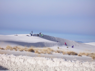 Als besonders attraktiv empfinden die Amerikaner dort wohl, dass man im Souvenirladen riesige Plastikscheiben (ähnlich wie Frisbee-Scheiben) mit ca. 1 m Durchmesser mieten oder kaufen kann, mit deren Hilfe man dann einfach die Dünen runterrutschen kann. Das sieht wirklich so ähnlich aus wie bei uns, wenn mal viel Schnee liegt und alle Kinder mit ihren Schlitten die Hügel runterrutschen. Nur dass es hier das ganze Jahr möglich ist.