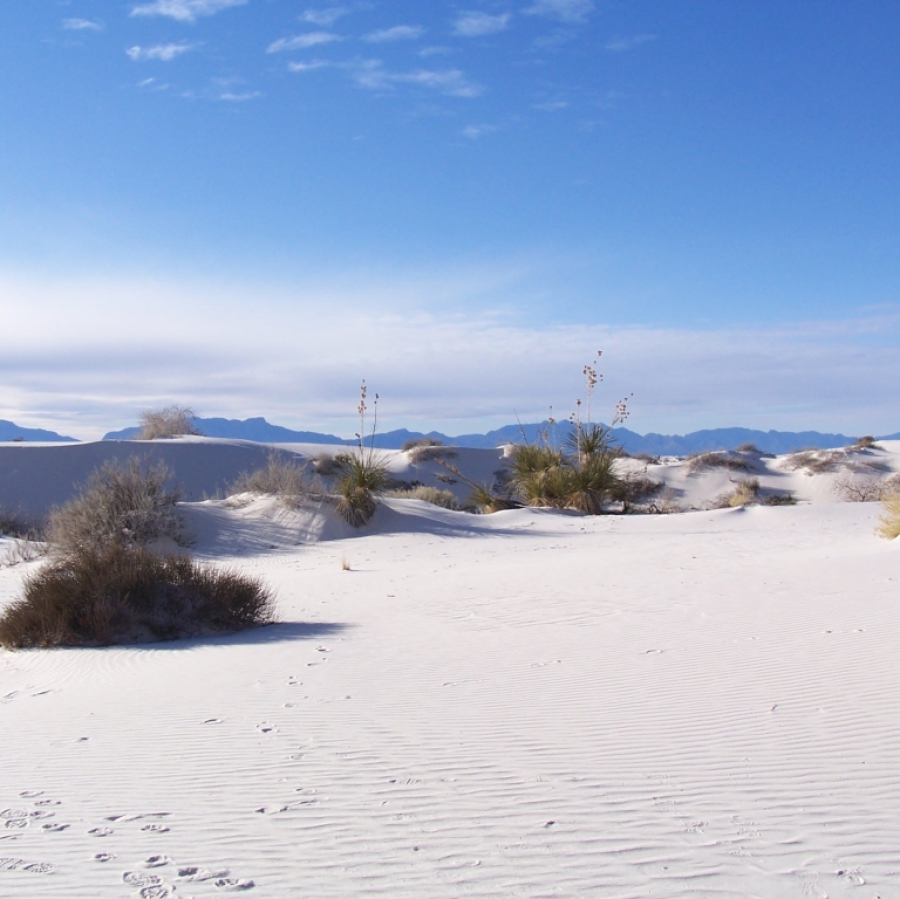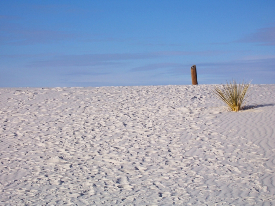 Zuerst führte eine geteerte Straße durch die Dünenlandschaft. Entlang dieser Straße waren immer wieder kleine Haltebuchten, in denen auf Tafeln erklärt war, was man dort gerade sehen konnte. Auch gab es einen Steg, der mitten in die Wüste hineinführte und immer wieder neue Fotomotive bot. Überhaupt präsentierten sich die bewachsenen weißen Gips-Dünen sehr fotogen.