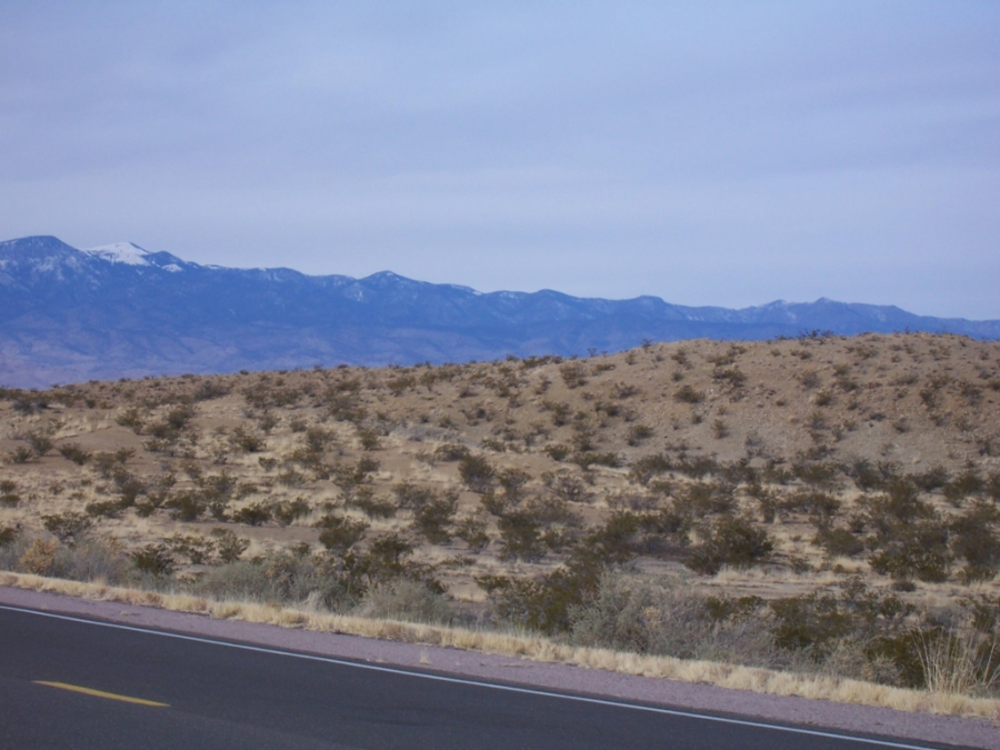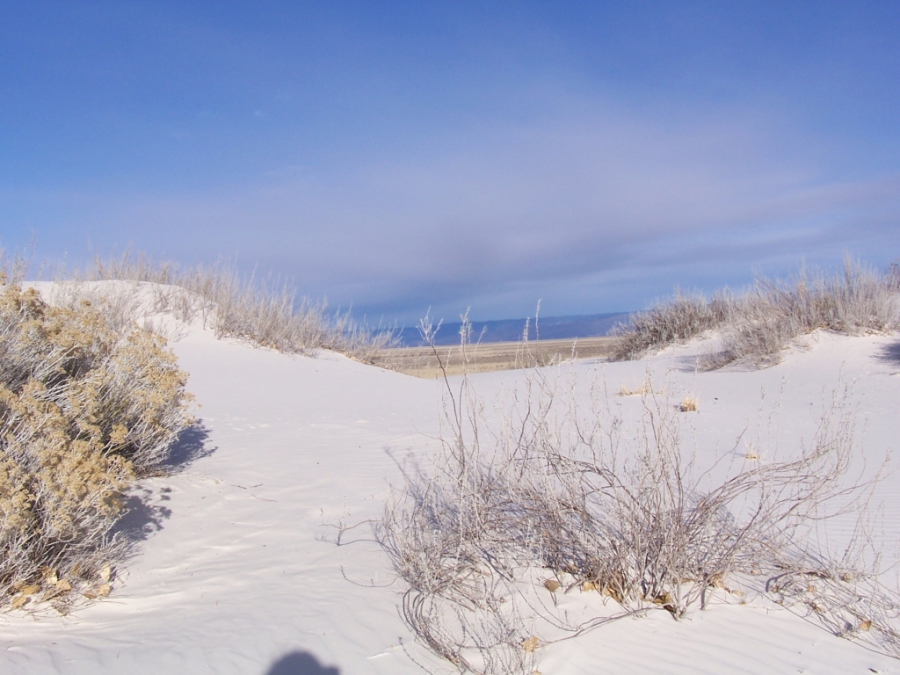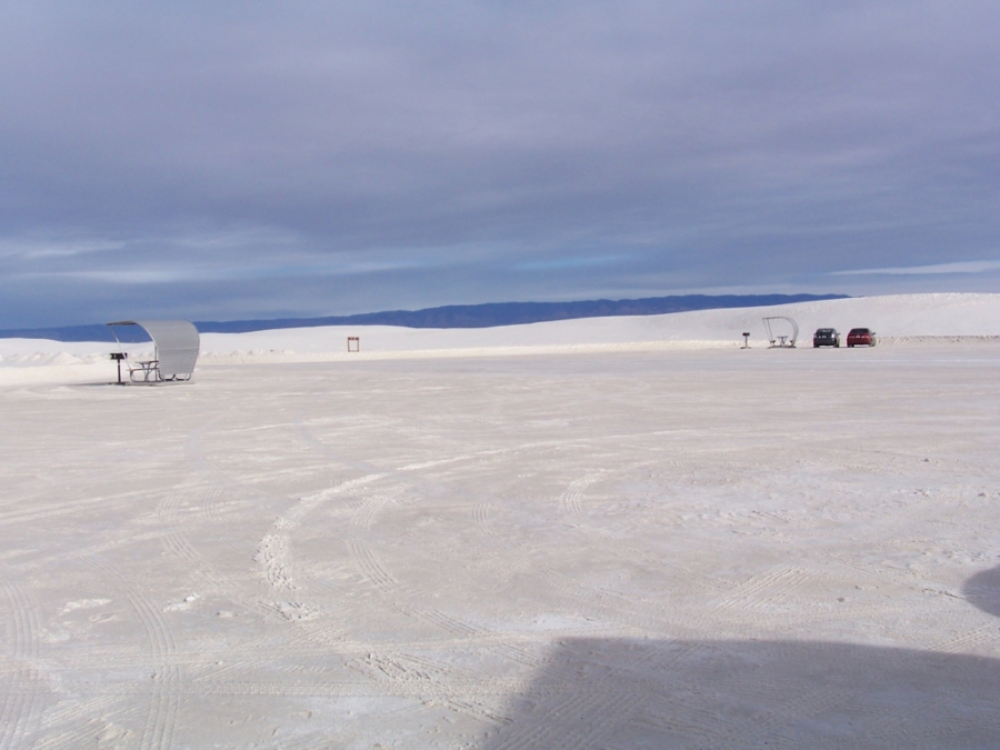Dann ging es auf Landstraßen weiter bis Alamogordo, einem etwas größerem Ort in der Wüste, der hauptsächlich von der Holloman Airforce Base (in er auch Bundeswehrsoldaten stationiert sind, die Tiefflug üben) und Touristen lebt. Da es erst kurz nach Mittag war, fuhr ich durch Alamogordo einfach durch; um eine Übernachtungsmöglichkeit konnte ich mich auch später noch kümmern. Mich rief einfach der große Sandkasten. Inzwischen war es auch schön warm geworden: +5° C.