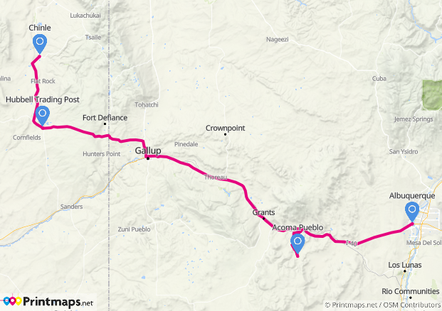 Heute ging es jetzt definitiv wieder nach Westen, aber erst mal mit einem kleinen Abstecher nach Acoma, der „Sky City“ und dann ging es nach Norden zur Hubbell Trading Post und weiter nach Chinle, einem Ort im Navajo-Reservat, der direkten Zugang zum Canyon de Chelly bietet.