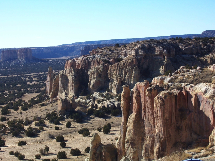 Aber zuerst musste ich Albuquerque verlassen. Und das war diesmal wirklich einfach: Hatte ich doch schon am Ortsrand Richtung Westen nicht weit von der Autobahn entfernt übernachtet. Dafür gestaltete sich die Suche nach einer Tankstelle etwas schwieriger: Musste ich dafür doch wieder die Autobahn verlassen. Aber dort gab es Sprit für das Auto sowie einen Eimer Cappuccino und eine große Zimtschnecke für mich (Muffins hatten die leider keine). Und dann ging es dieselbe Strecke nach Westen, die ich bei meiner Flucht vor dem Schnee nach Osten gefahren bin. Aber diesmal präsentierte sich die Landschaft ganz anders: Die Sicht war hervorragend, so dass die umliegenden Berge mit Schneehauben und davor die rot-braun-gestreiften Felsen deutlich sichtbar waren bei einem wolkenlosen blauen Himmel. Nur die Temperatur passte nicht wirklich dazu; die war nur wenig über 0° C.